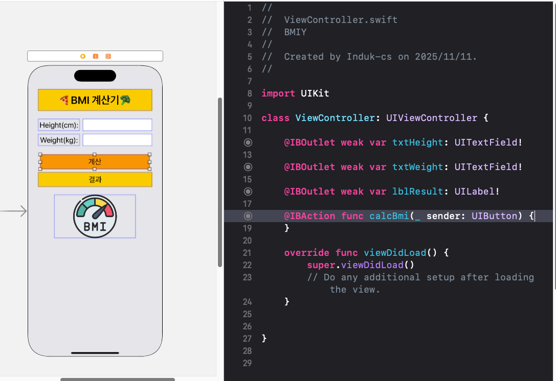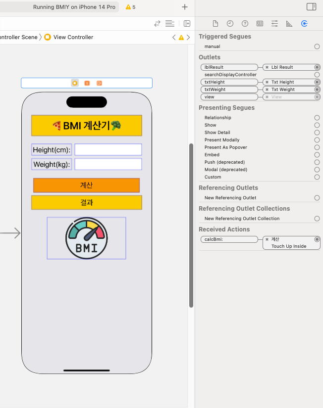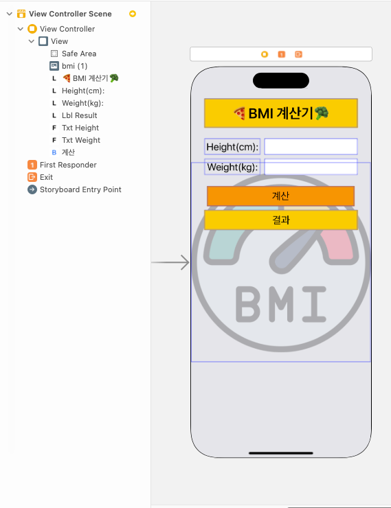 - UITextField (2๊ฐ): ํค ์ ๋ ฅ, ๋ชธ๋ฌด๊ฒ ์ ๋ ฅ